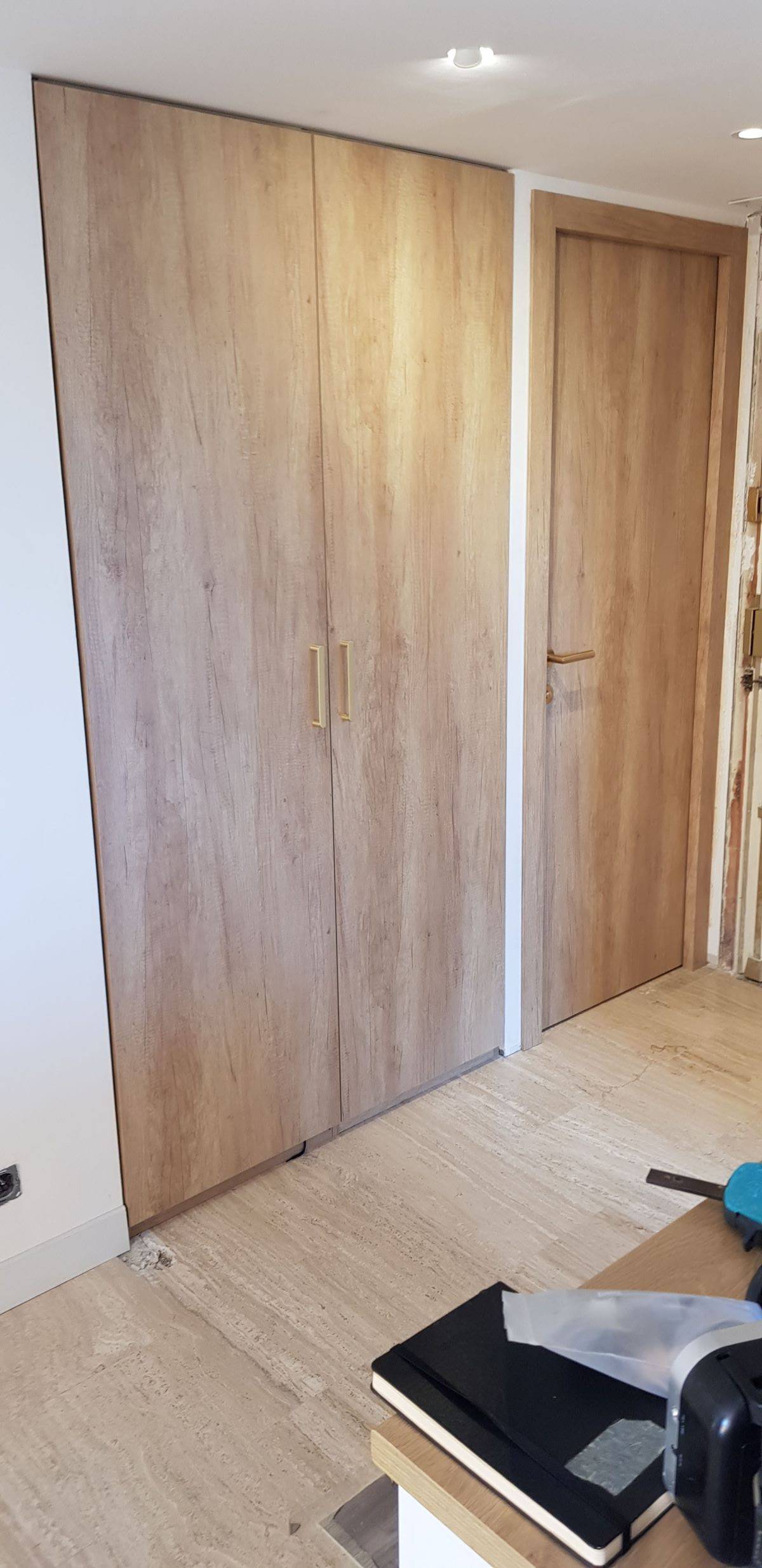 Aménagement intérieur complet avec fabrication sur mesure de mobilier en mélaminé stratifié ton bois chêne clair et finitions bouton doré.