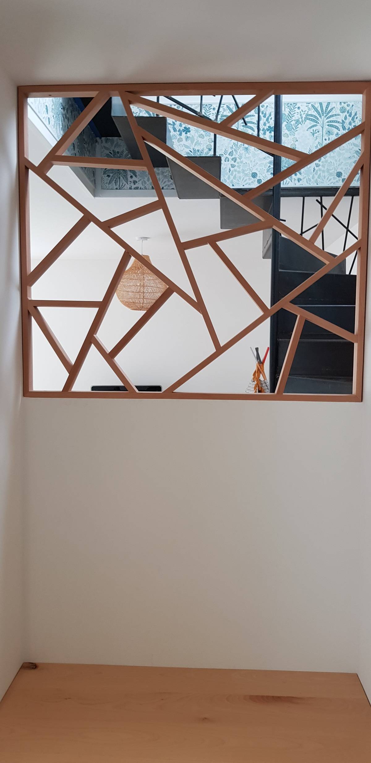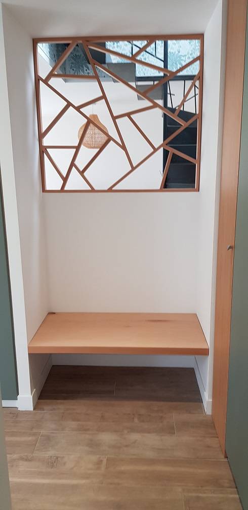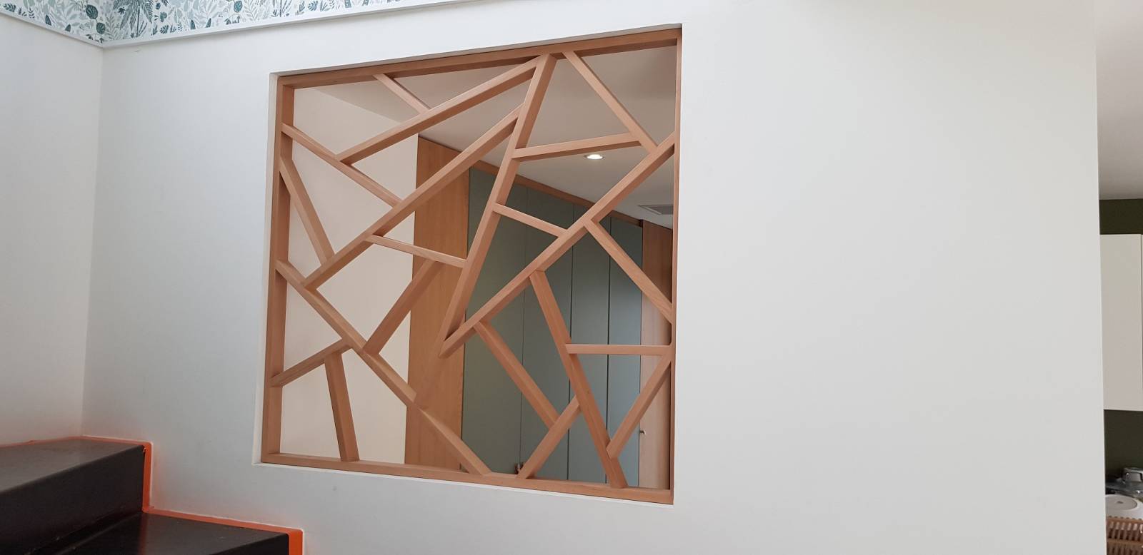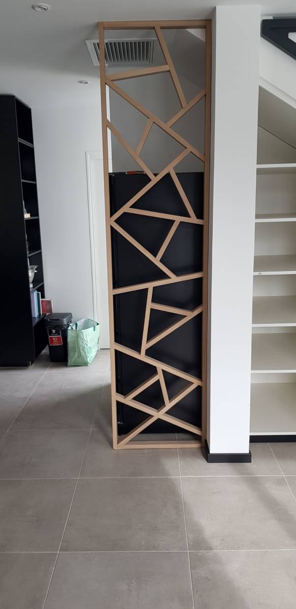 Nous avons conçu un claustra asymétrique en chêne massif, véritable élément signature du projet. Il permet de délimiter l’espace tout en laissant circuler la lumière naturelle. Son design original apporte une touche contemporaine et met en valeur l’ouverture avec élégance.