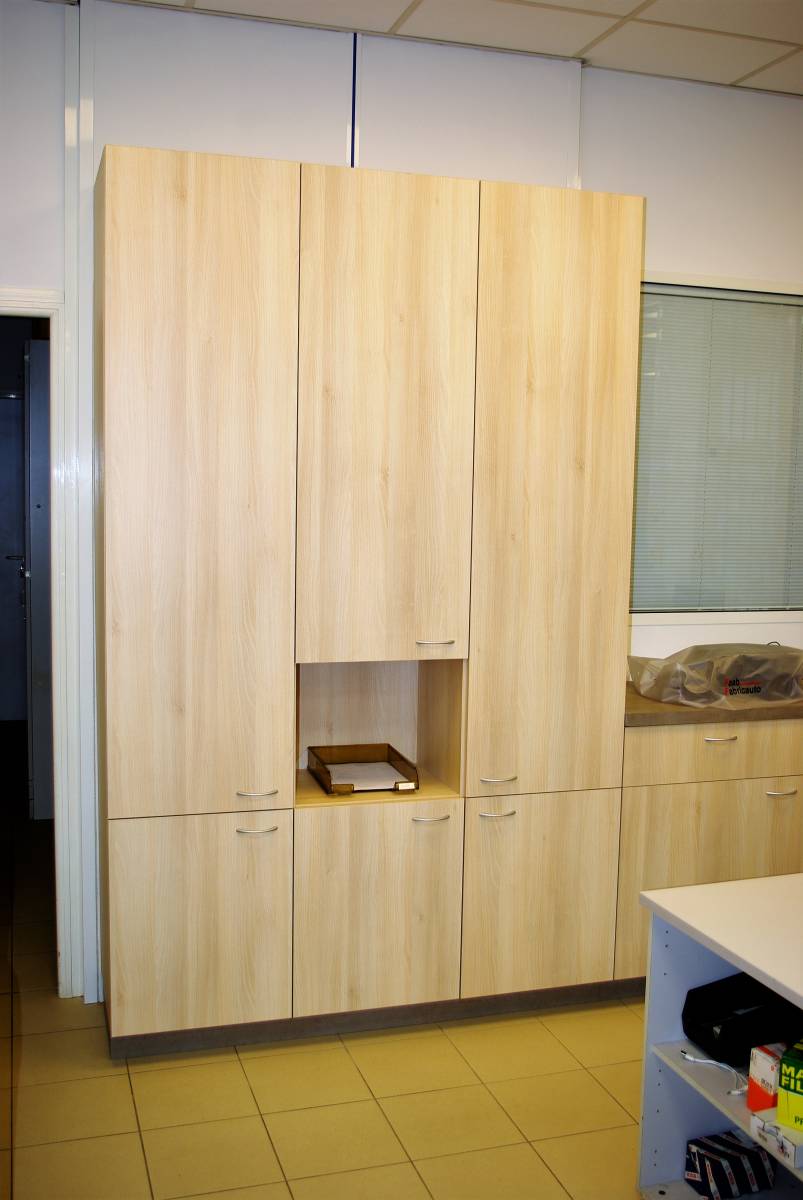 Ce comptoir tout en arrondi est accompagnée d'un grand espace de rangement fonctionnel et esthétique à l'arrière. Cet espace de rangement a été créé en fonction des besoins de l'entreprise et les contraintes de l'espace. Ainsi pour maximiser l'espace, une grande armoire et des caissons bas ont été installé avec de grandes portes battantes et des tiroirs.
