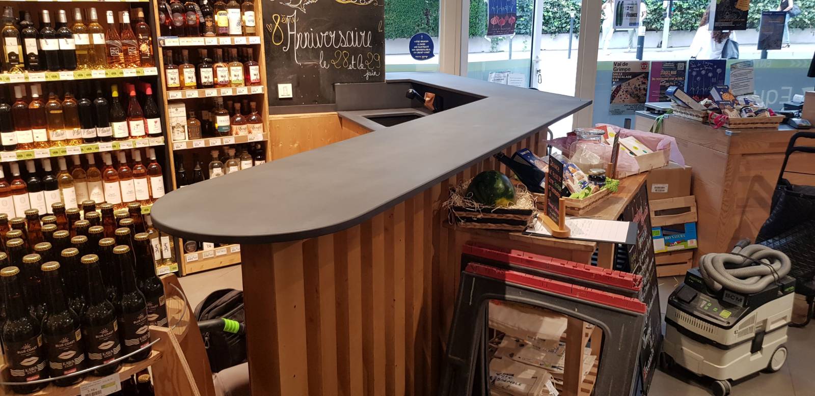 Nous sommes fiers d'annoncer notre partenariat avec Biocoop pour l'installation de nouveaux présentoirs en épicéa 3 plis ainsi qu'un comptoir avec plan de travail noir chez Biocoop Vence.