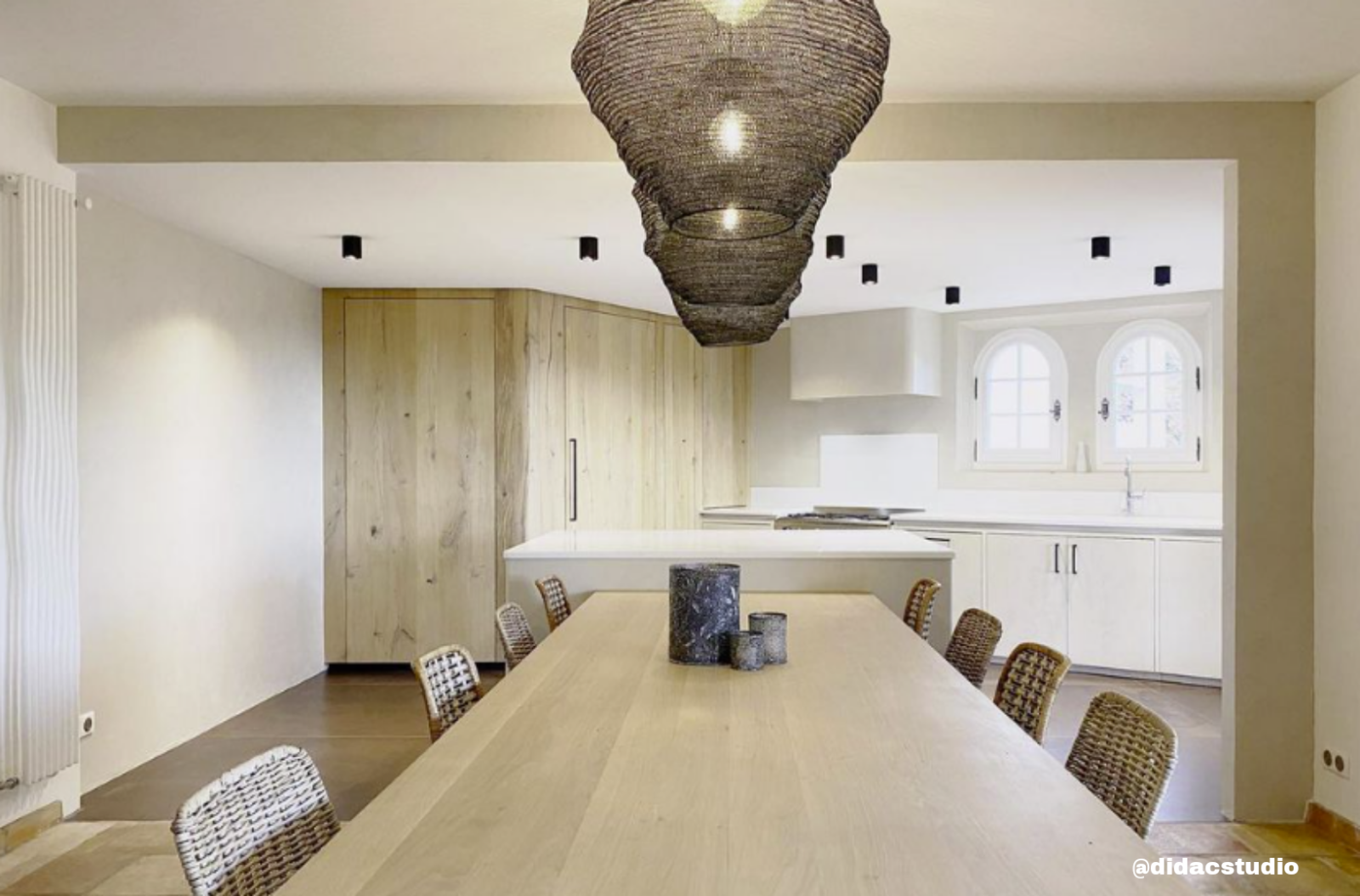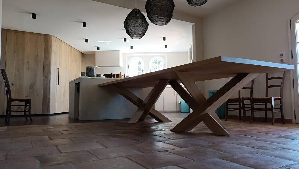 Ce projet complet comprend notamment une cuisine en médium patiné associée à un mélaminé chêne, une table avec ses pieds croisés en chêne massif, ainsi qu’un meuble télévision mêlant chêne massif et structure en aluminium laqué.