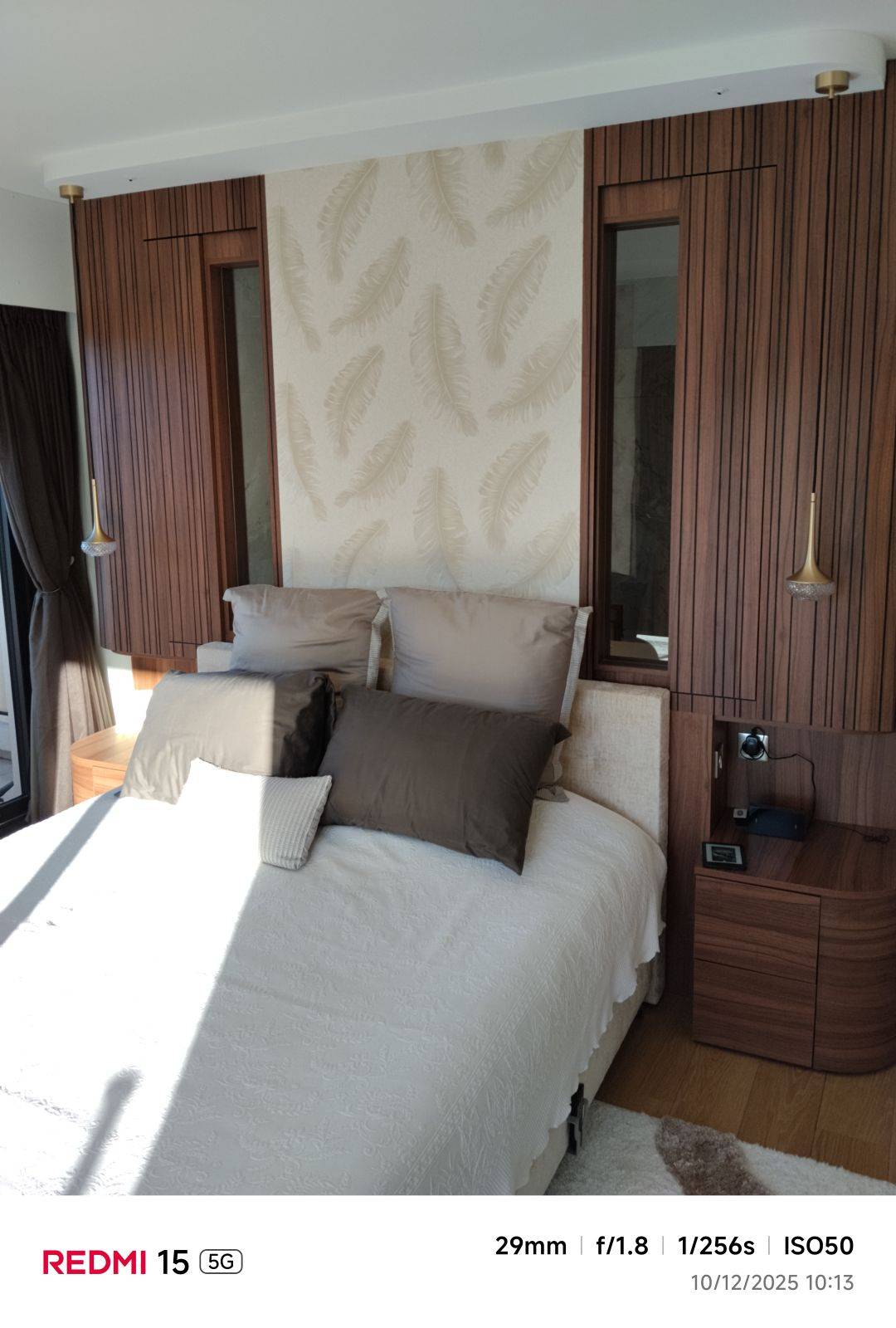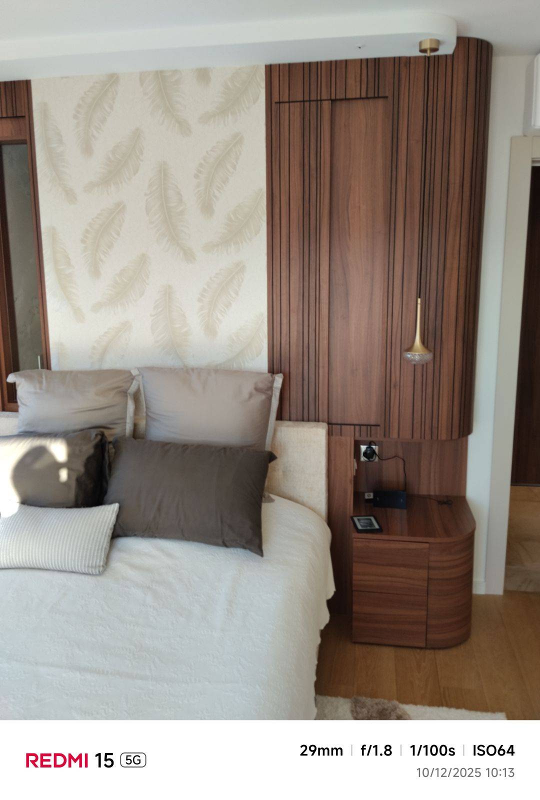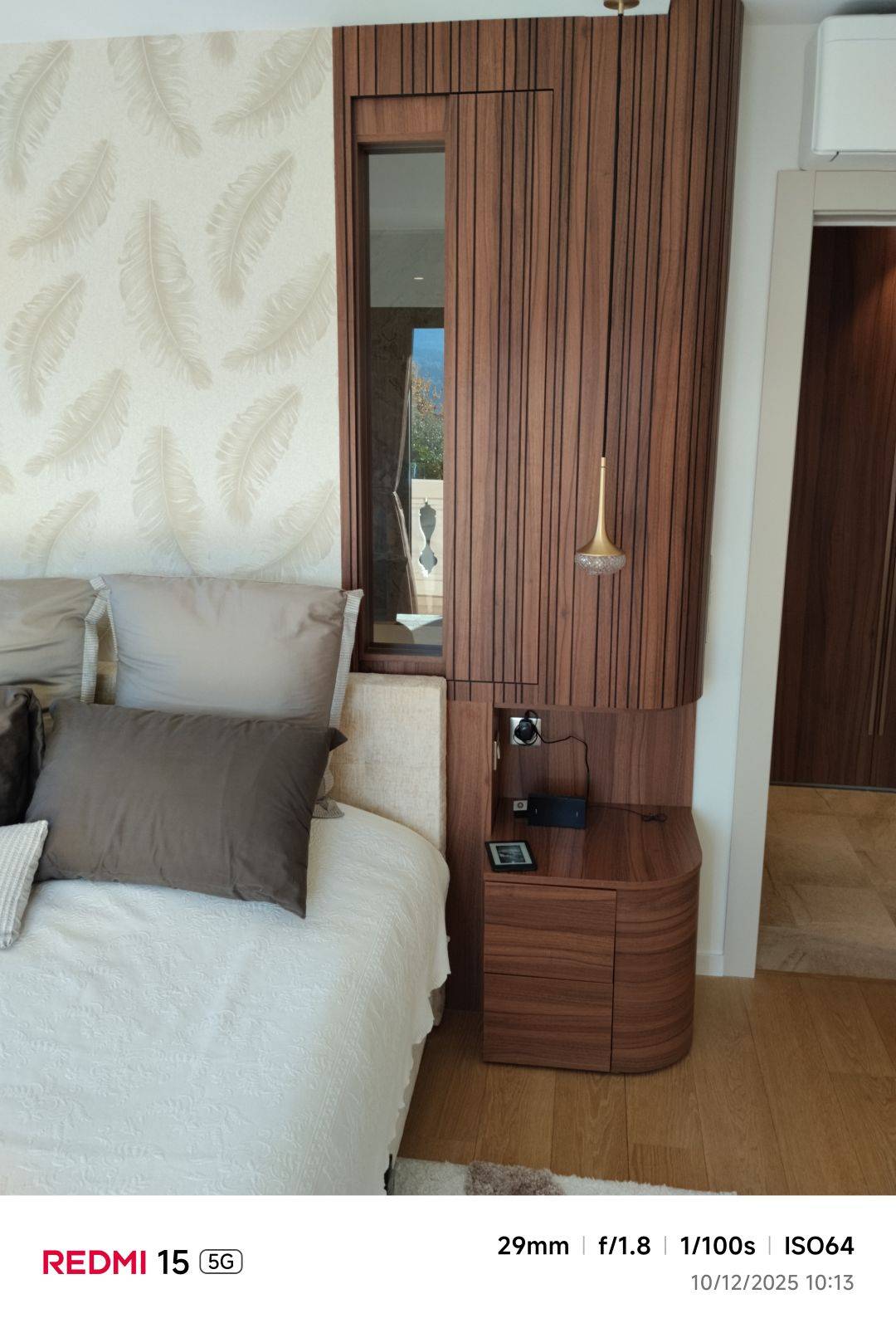 Notre entreprise vous propose la conception et la fabrication d’une tête de lit sur mesure, réalisée avec un haut niveau d’exigence et une attention particulière portée aux détails, pour nos clientes à Mandelieu La Napoule. Cet aménagement se compose d’un habillage mural en lattes de tailles irrégulières, créant un jeu de reliefs élégant et dynamique. Les lattes sont réalisées en plaquage stratifié finition Noyer de Bourgogne, appliqué sur un support en MDF noir afin de renforcer la profondeur visuelle et le contraste.